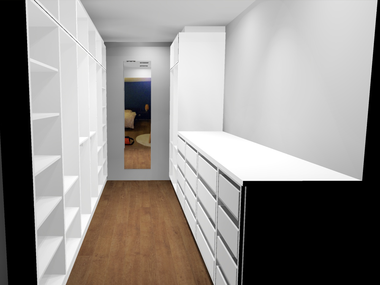 VTkamerontwerp koos bij dit ontwerp voor een ‘open’ dressing (een ‘gesloten’ dressing behoort uiteraard ook tot de mogelijkheden). Door de keuze voor een ‘open’ dressing blijft het geheel overzichtelijker en de ruimte breder. Door het plaatsen van een centrale spiegel oogt de kamer niet enkel groter, maar heeft deze uiteraard ook een grote meerwaarde bij het kiezen en passen van een outfit.