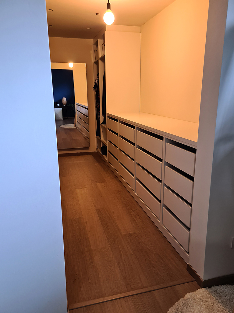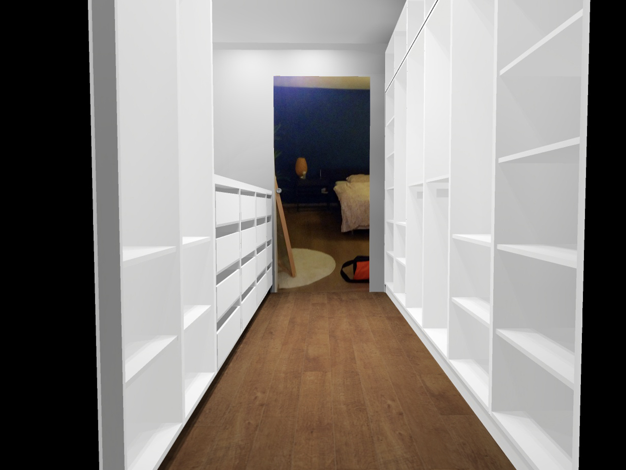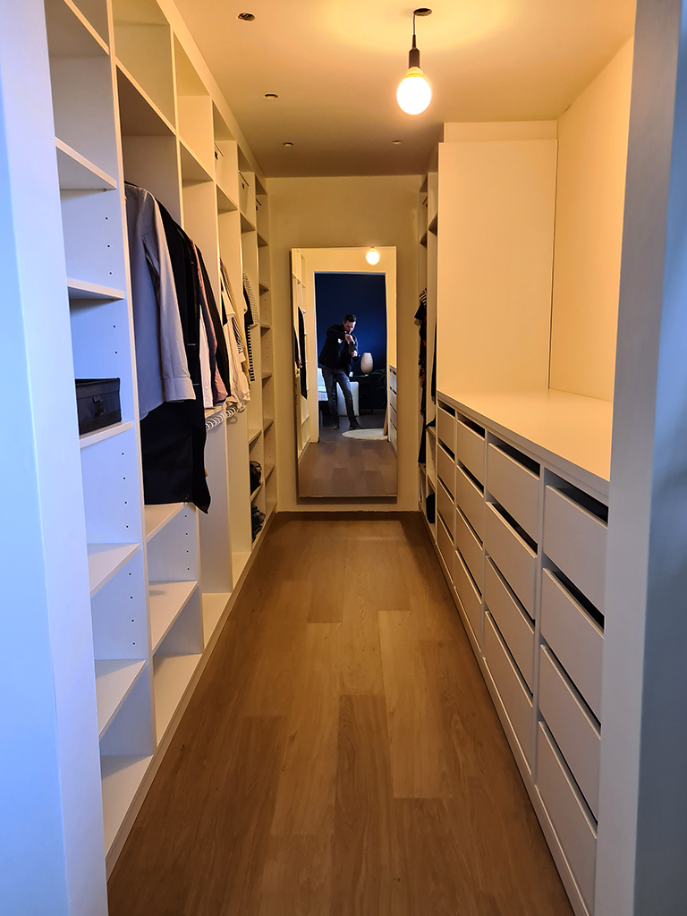 Een dressing of inloopkast is de ideale plaats om kledij netjes op te bergen en kan geïntegreerd worden in de slaapkamer. Met een dressing ‘op maat’ win je bovendien ruimte, omdat je elke ‘verloren’ cm van de kamer kan benutten. Ook een ongebruikte ruimte in je huis kan omgebouwd worden tot een mooie en praktische dressing. Zo bood een kleine, aanpalende kamer hier de mogelijkheid om - naast de slaapkamer van het koppel - de droom van een eigen dressing te realiseren. Ondanks de smalle ruimte konden we, door middel van brede lades en kasten aan beide kanten, toch voldoende kastruimte voorzien.