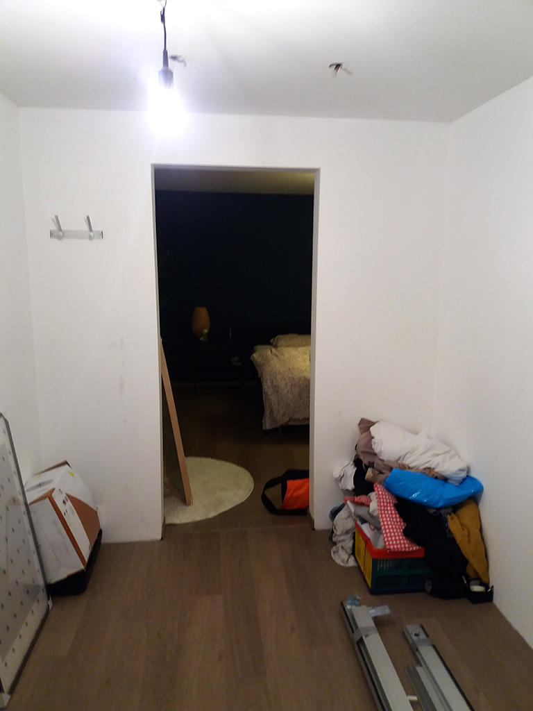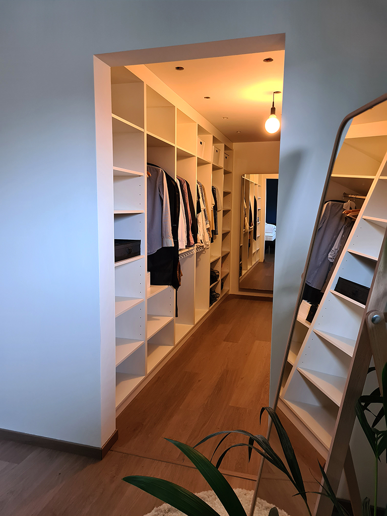 Tot slot werd er boven de kledinglades plaats vrijgehouden om kledingstukken terug op te vouwen of neer te leggen tijdens het passen. De kleine kamer werd dus niet enkel functioneel, maar ook esthetisch opgewaardeerd.
