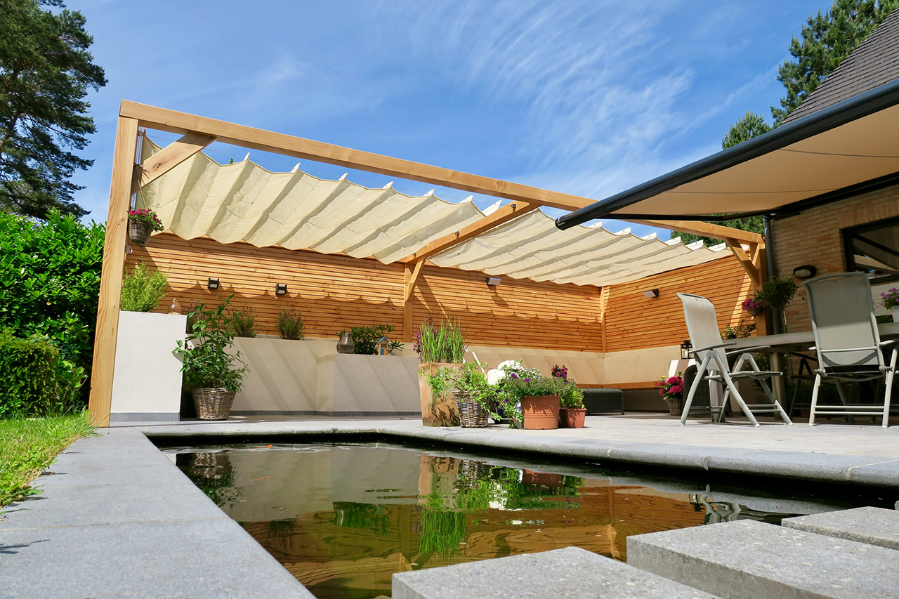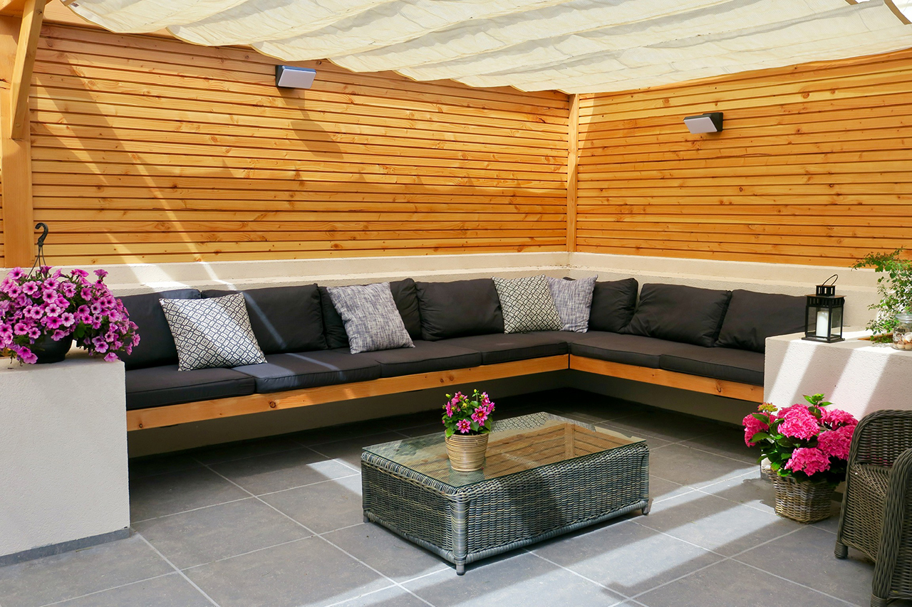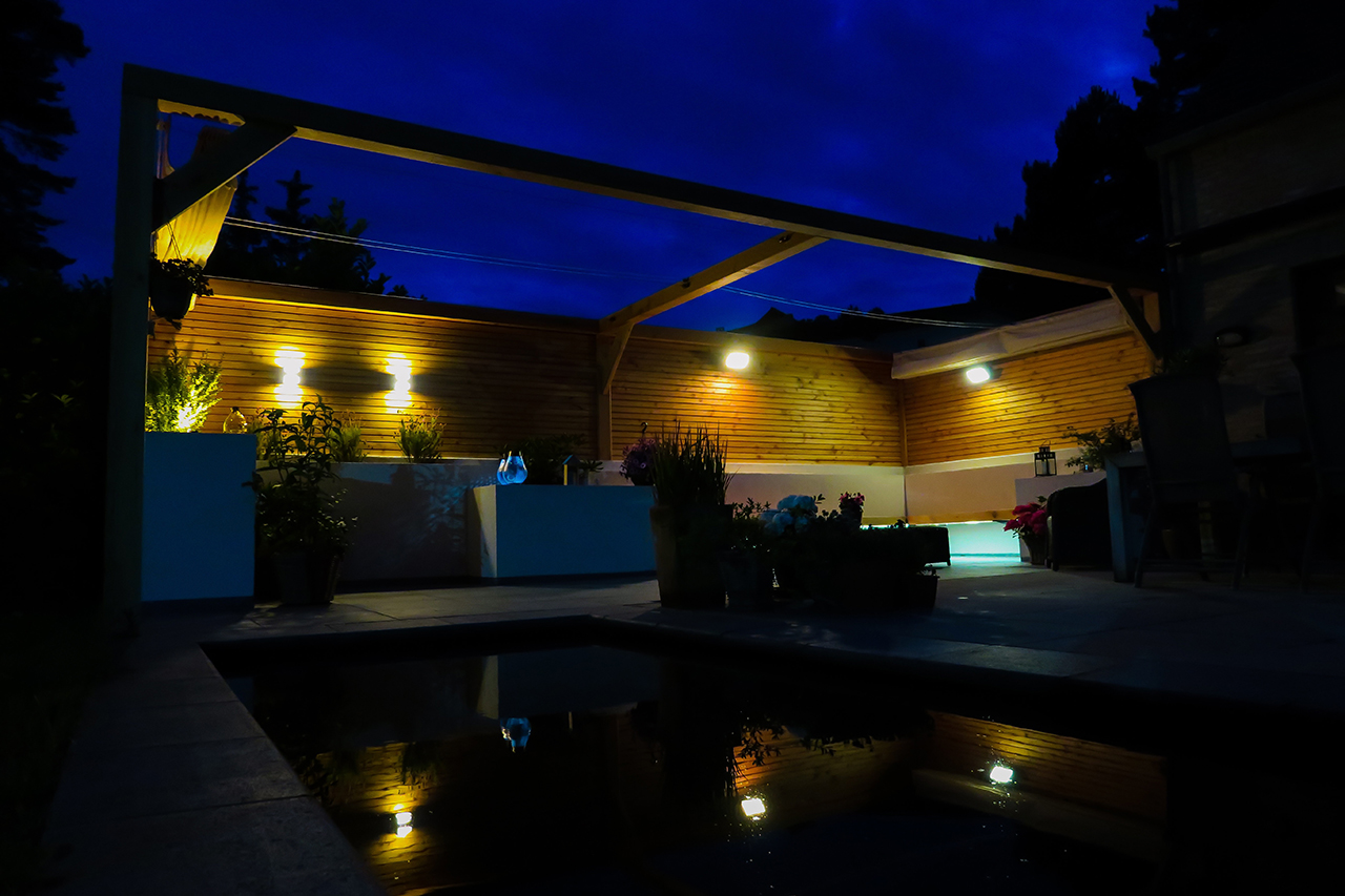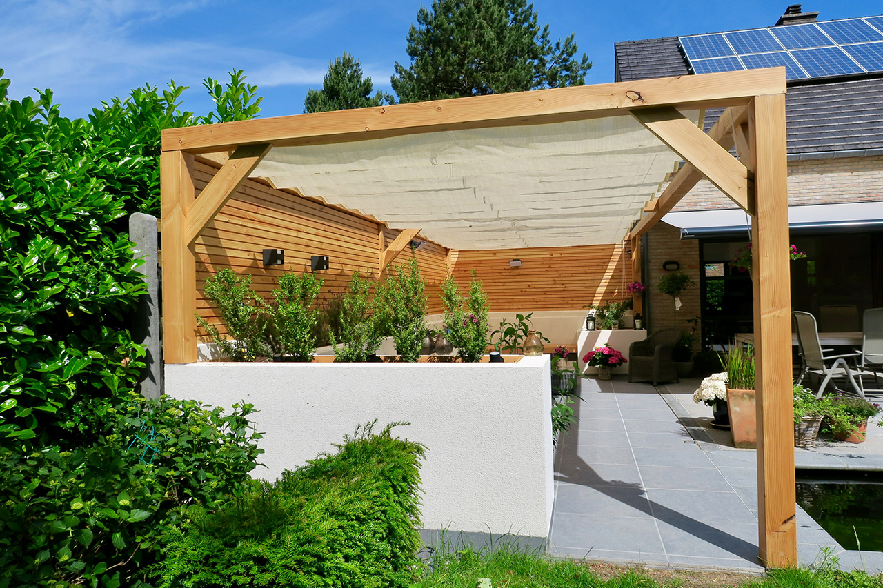 Deze klanten hechtten veel belang aan een mooie tuin, waar ze volledig tot rust konden komen. Om die reden lieten ze al een vijver en terras aanleggen, maar er ontbrak nog iets. Wij kregen dan ook de opdracht om een lounge te ontwerpen waar ze niet alleen konden ontspannen, maar ook energie opdoen. Bij het maken van dit ontwerp hielden we uiteraard rekening met het terras en de vijver, om tot een mooi geheel te komen. VTkamerontwerp stond niet alleen in voor het ontwerp, maar eveneens voor de volledige uitvoering; zijnde de houten constructie, het plaatsen van de tegels, het bijbehorend metselwerk en het voorzien van de nodige elektriciteit, zitbanken en zonnewering. De buitenoppervlakte wordt nu optimaal benut en zorgt ervoor dat het zowel overdag als ’s avonds – met of zonder het gezelschap van vrienden - aangenaam vertoeven is in de tuin.