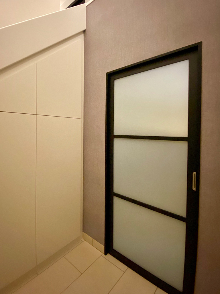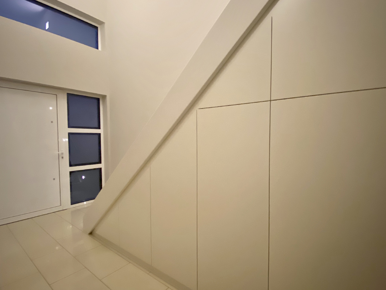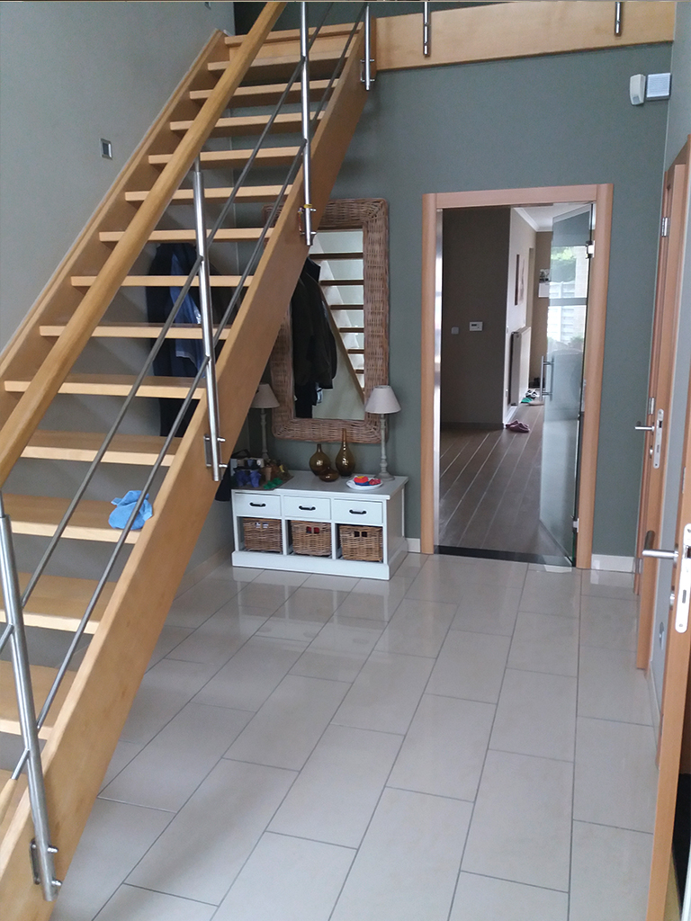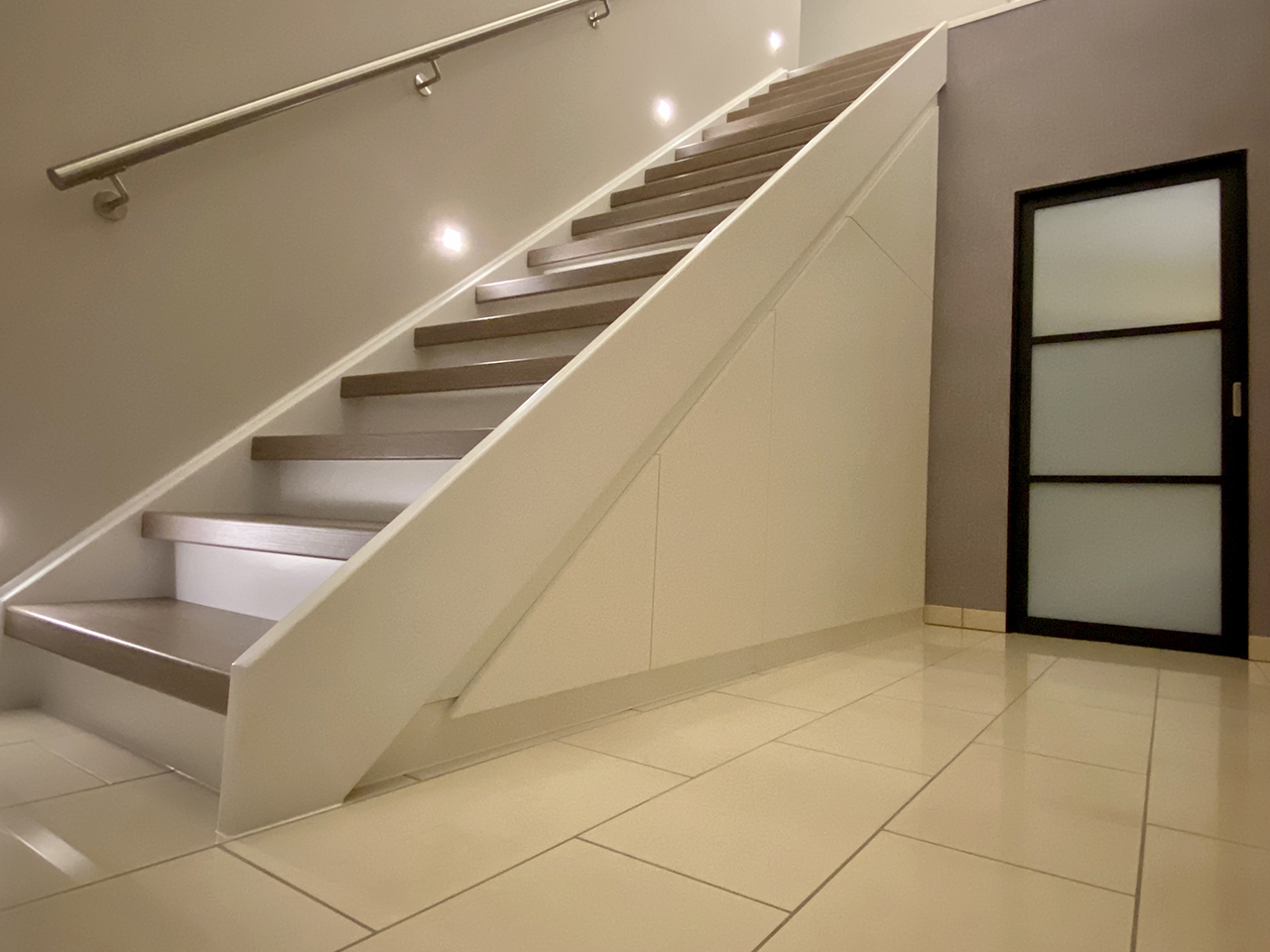 Onder een trap ontstaat vaak een nutteloze ruimte.  Dat is erg jammer. Om de ruimte onder deze trap optimaal te benutten en in te richten, ontwierp VTkamerontwerp voor deze klant enkele maatkasten.  Het was tevens de wens van de klant om deze ruimte een moderne look te geven.  Het gebruik van ‘greeploze’ kastfronten, in combinatie met een nieuwe inox muurleuning, zorgen voor een strak geheel.  Verder werd de traditionele, klassieke deur vervangen door een schuifdeur, die volledig werd ingewerkt in een voorzetwand.