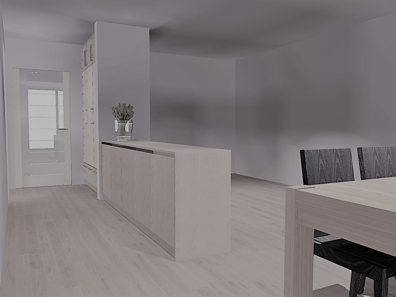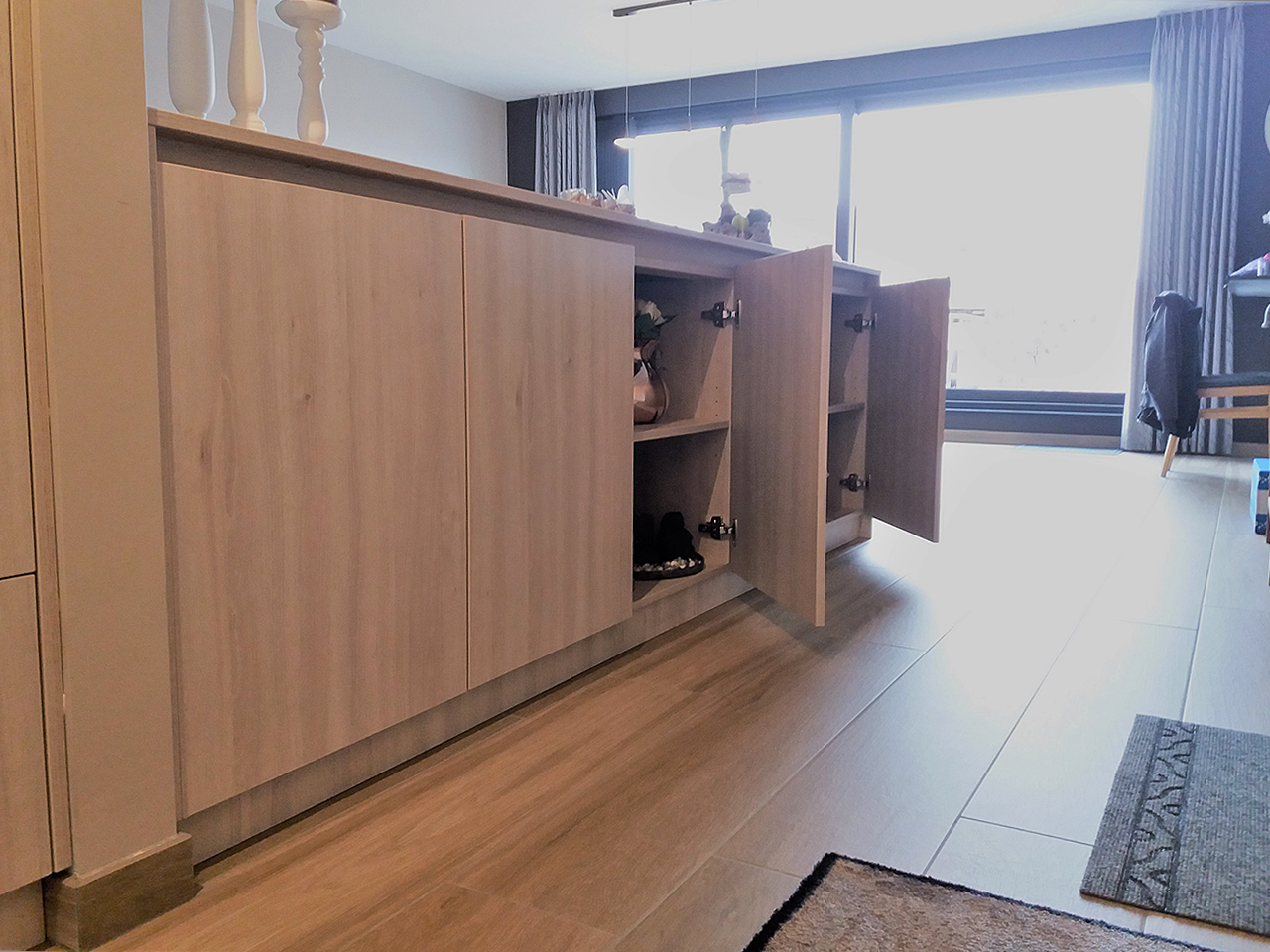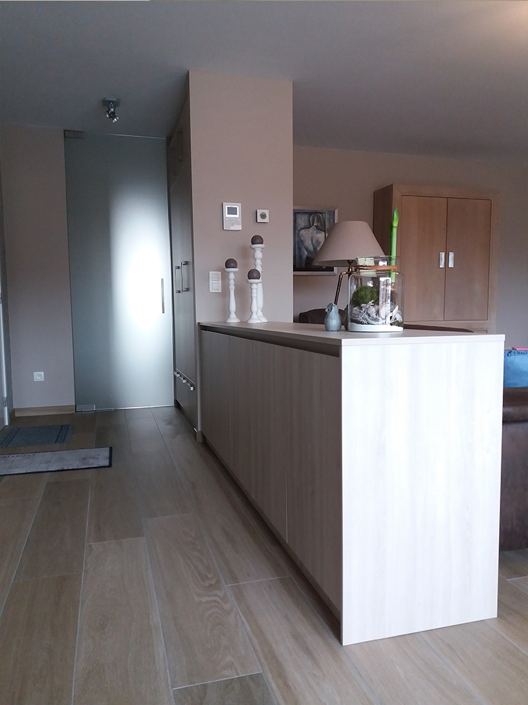 Door het plaatsen van een roomdivider kwam VTkamerontwerp tegemoet aan de vraag om zowel een aparte ontvangstruimte als extra opbergmogelijkheden te voorzien. Door de roomdivider werden de ontvangstruimte en leefruimte van elkaar gescheiden, zonder afbreuk te doen aan het ruimtelijk en open gevoel.