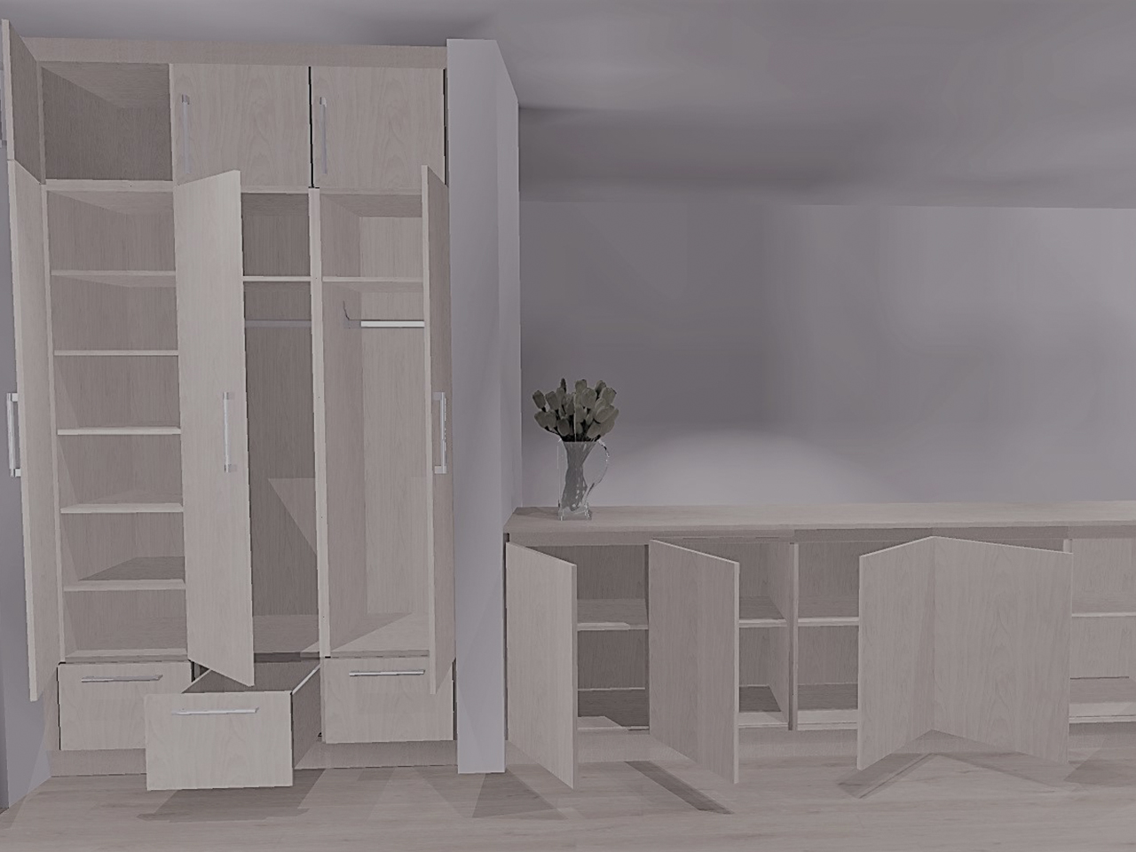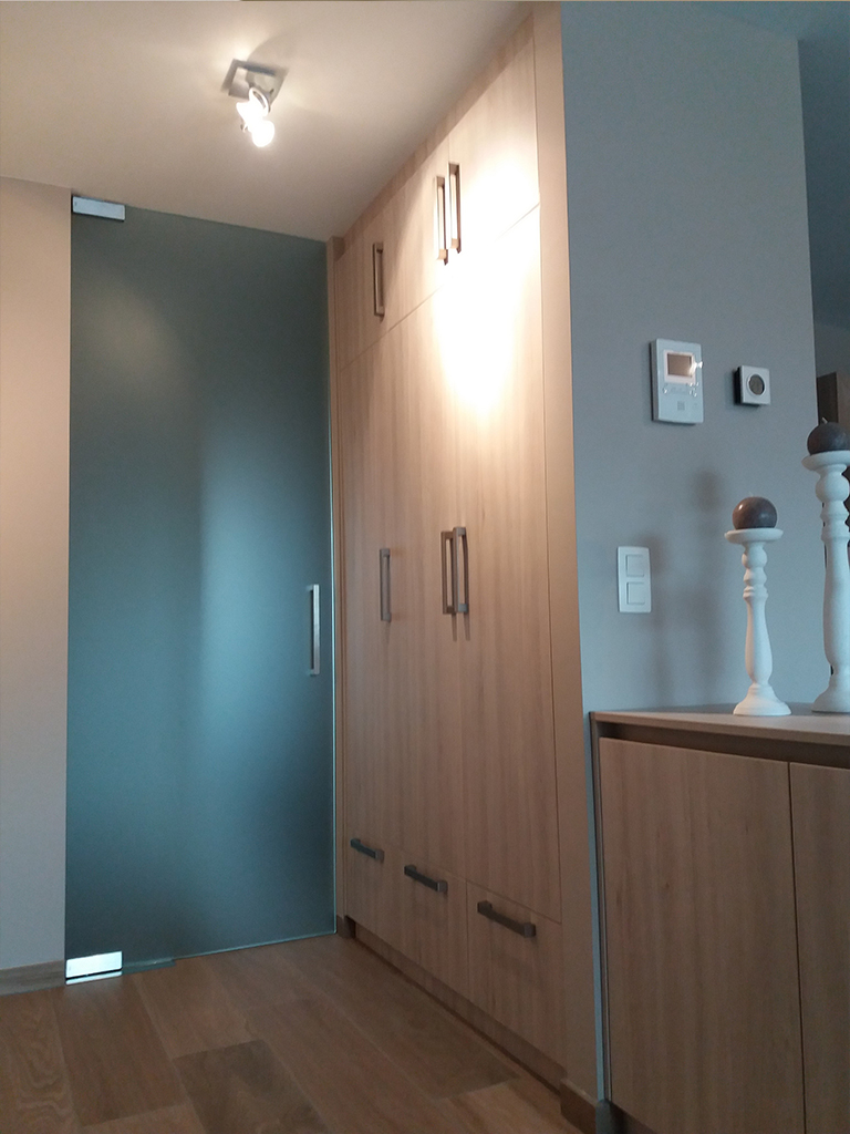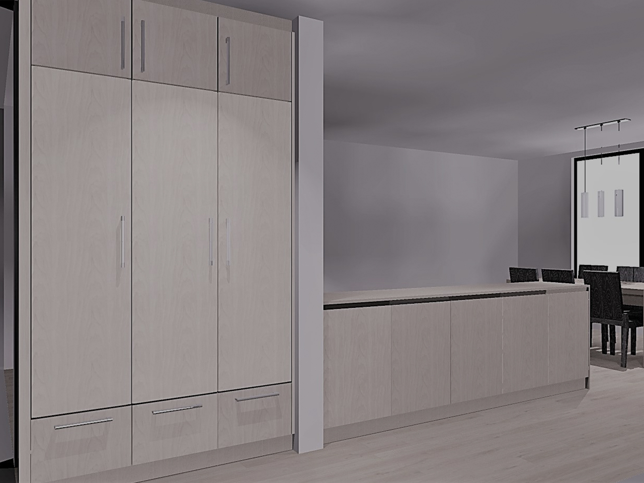 Door het plaatsen van een roomdivider kwam VTkamerontwerp tegemoet aan de vraag om zowel een aparte ontvangstruimte als extra opbergmogelijkheden te voorzien. Door de roomdivider werden de ontvangstruimte en leefruimte van elkaar gescheiden, zonder afbreuk te doen aan het ruimtelijk en open gevoel.